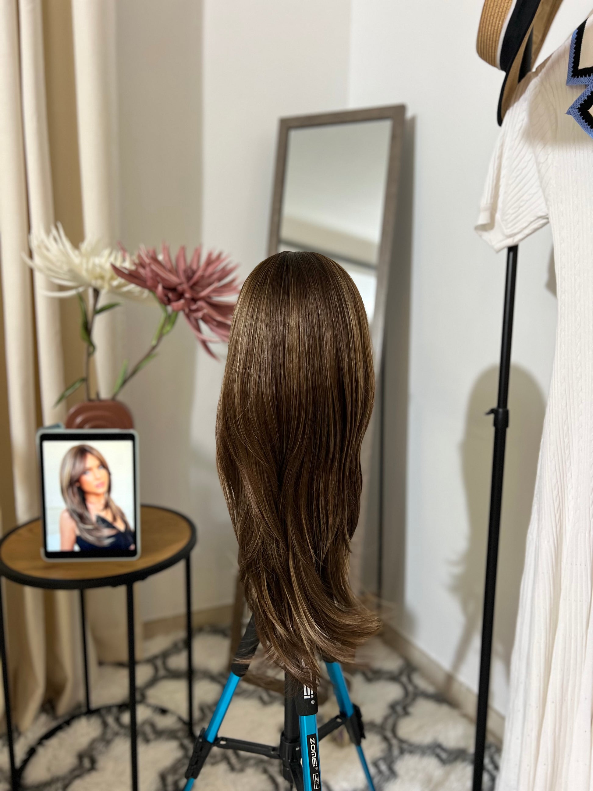 - Made of high-quality chemical fiber hair, this medium long straight wig features a natural-looking brown highlight with a medium part and bangs.